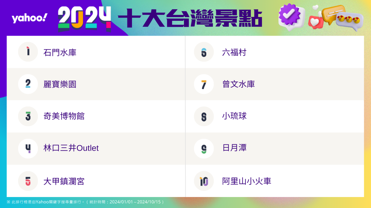 Trong danh sách còn có “Hồ chứa nước Zengwen”, hồ nước lớn nhất Đài Loan với cảnh quan hùng vĩ không góc chết, xếp hạng bảy. “Tiểu Lưu Cầu”, hòn đảo san hô duy nhất của Đài Loan với kỳ quan thiên nhiên là Đá Bình Hoa xếp hạng tám. “Hồ Nhật Nguyệt”, bao quanh bởi núi non tuyệt mỹ, văn hóa thổ dân sâu sắc và lịch sử ngành gỗ tráng lệ, xếp hạng chín. Đặc biệt, tuyến đường sắt nhỏ Alishan khôi phục toàn tuyến và giới thiệu các chuyến tàu tematis “Xusiuyou” và “Fusen” cùng với chuyến tàu gỗ quý ngày lễ thu hút sự chú ý, xếp hạng mười.