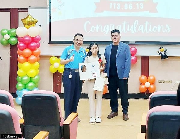 ▲Học viên Nguyễn Thị Kim Thanh (ở giữa) cùng với cựu hiệu trưởng Tiểu học Hậu Phố, ông Tạ Trị Bình (bên trái), và Phó Chủ tịch Hội Phụ huynh Lô Nhạc Khiêm (bên phải) trong buổi lễ tốt nghiệp nhận chứng chỉ. (Ảnh: Sở Giáo dục thành phố Tân Bắc cung cấp).