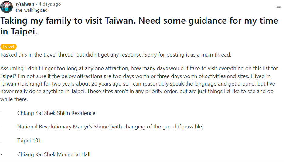Một người dùng mạng nước ngoài đã đăng bài hỏi về việc anh ta muốn biết cần bao nhiêu ngày để khám phá hết các điểm du lịch tại Đài Bắc. (Ảnh: Chụp màn hình từ Reddit)