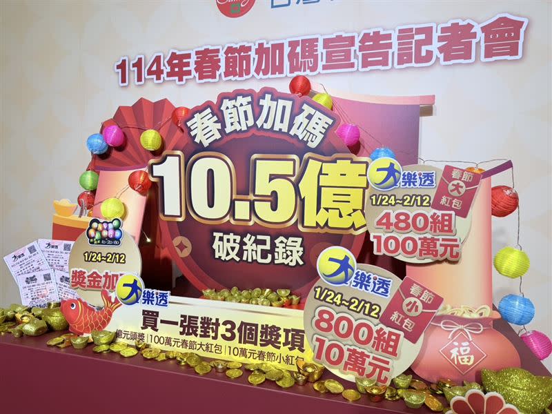 Tổng cộng giải thưởng Tết Nguyên Đán năm thứ 114 lên đến 1,05 tỷ Đài tệ. Ngoài giải thưởng cao chưa từng có, từ ngày 24 tháng 1, các trò chơi như “Jin Cai 539”, “39 Le He Cai”, “49 Le He Cai”, “3 Xing Cai” và “4 Xing Cai” sẽ mở thưởng liên tục trong 20 ngày, cùng người dân tham gia đến Rằm tháng Giêng. Điều này nhằm giúp người dân đón Tết với thần tài, mua vé số may mắn và tạo cơ hội cho những điều tốt đẹp xảy ra.