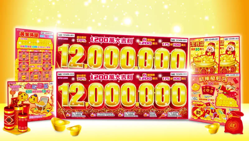 Công ty Xổ số Đài Loan trong ngày 13 tháng này đã giới thiệu năm sản phẩm vé số cào mới để đón mừng năm mới, gồm “1.200 vạn Đại Cát Lợi”, “Tài Thần Phát Bao Đỏ”, “Kim Xà Báo Hỷ”, “Hoàng Kim Mãn Ốc” và “Tụ Bảo Bồn”. Tổng số giải thưởng của năm sản phẩm này vượt qua 16,83 triệu giải, với tổng giá trị giải thưởng hơn 98 tỷ Đài tệ.