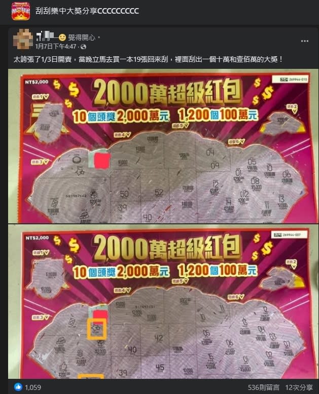 Một bài viết đã thu hút hơn 1000 lượt thích từ cộng đồng mạng, với rất nhiều bình luận chúc mừng. Tác giả bài viết cũng phản hồi trong phần bình luận rằng họ đã mua vé cào tại khu vực Đại Viên, thành phố Đào Viên. Tổng chi phí mua vé là 38 triệu đồng Đài Loan, và trong đó chỉ có vài giải lớn: một vé trúng 5000 Đài Tệ, một vé trúng 100,000 Đài Tệ, và một vé trúng 1 triệu Đài Tệ. Các vé còn lại đều trúng giải 1000 Đài Tệ và 2000 Đài Tệ, với 3 vé không trúng giải nào. Sau khi trừ đi tiền vốn và thuế, người này tổng cộng đã kiếm được 861,600 Đài Tệ.
