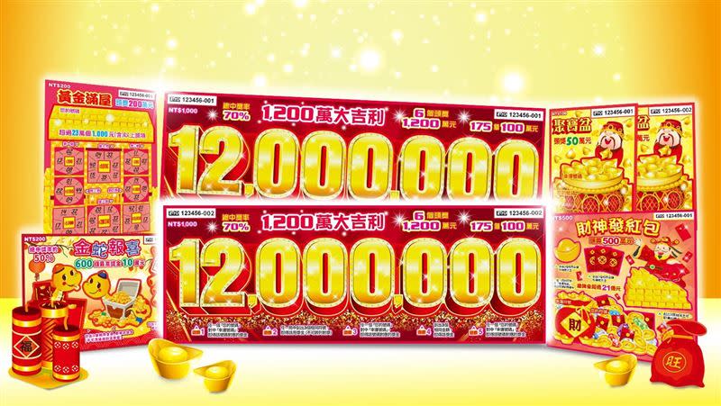 Lễ hội xổ số cào đầu xuân bùng nổ! Hôm nay (ngày 13), công ty xổ số Đài Loan công bố ra mắt 5 sản phẩm mới phù hợp với dịp Tết gồm “1,200 vạn Đại Cát Lợi”, “Thần Tài Phát Bao Lì Xì”, “Rắn Vàng Báo Hỉ”, “Ngôi Nhà Vàng” và “Bể Tài Lộc”. Tổng số giải thưởng có hơn 16,83 triệu giải và tổng giá trị giải thưởng vượt 9,8 tỷ Đài tệ, sẵn sàng mang đến cho người dân niềm vui khi cào trúng thưởng và đón vận may trong dịp năm mới âm lịch.