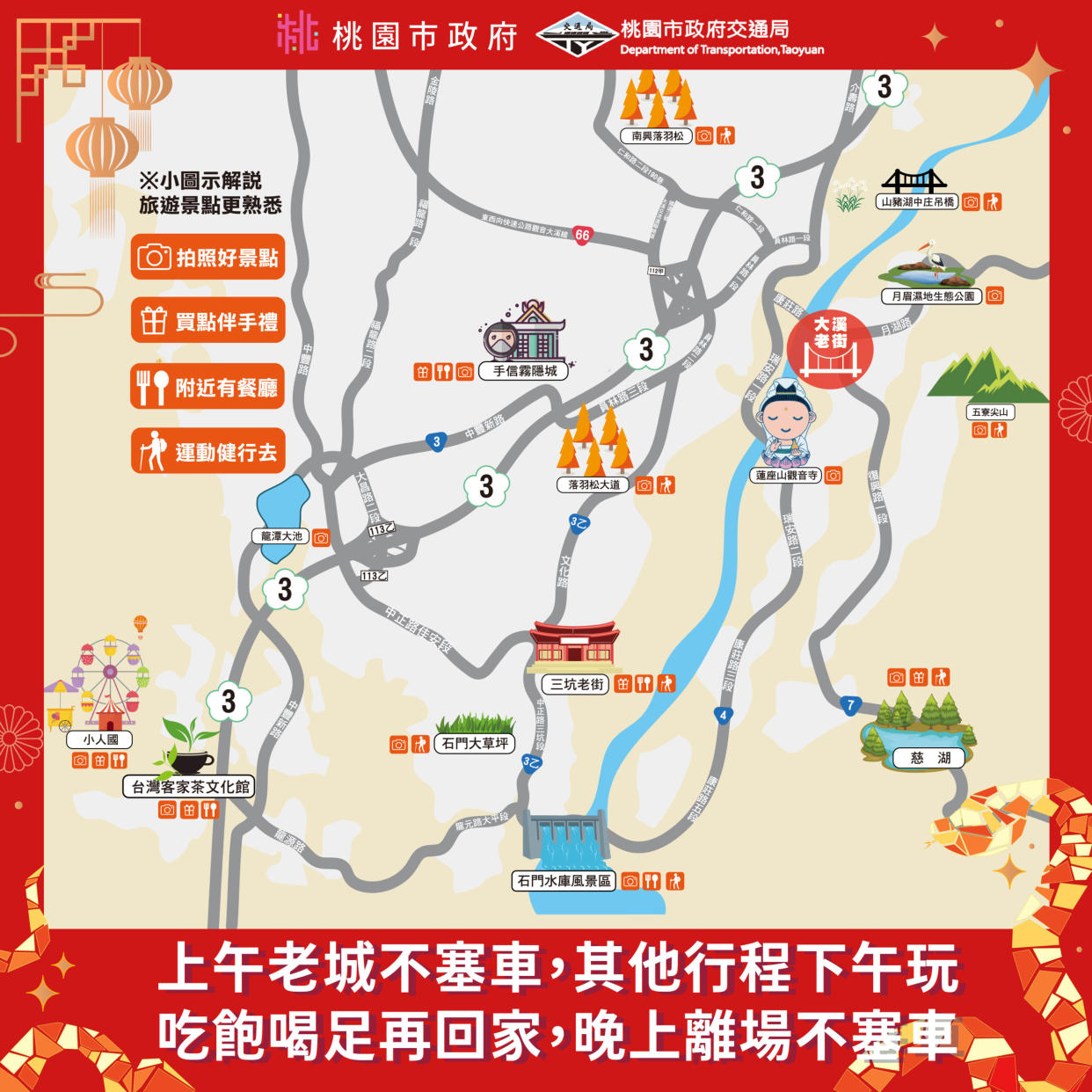 Giám đốc Sở Giao thông Trương Tân Phúc kêu gọi rằng trong kỳ nghỉ Tết Nguyên Đán, lượng người và xe cộ tăng cao, người dân cần lên kế hoạch du lịch trước khi ra đường. Để biết thông tin giao thông thời gian thực hoặc tình hình đám đông tại các điểm tham quan, người dân có thể sử dụng website thông tin giao thông Đào Viên, website hướng dẫn du lịch Đào Viên và ứng dụng “Đào Viên Dễ Dàng Đi” để tra cứu tình hình giao thông và đám đông. Đồng thời, lựa chọn đường đi thay thế khi cần thiết. Trước khi xuất phát, mọi người có thể tham khảo đèn cảnh báo số lượng khách trên website hướng dẫn du lịch Đào Viên để tránh trạng tắc nghẽn hoặc tình trạng khó tìm chỗ đậu xe. Hy vọng mọi cư dân sẽ có chuyến đi an toàn và một kỳ nghỉ Tết vui vẻ.