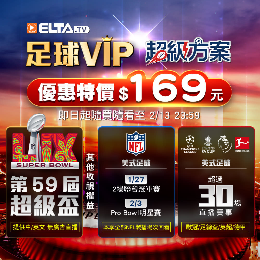 Sự kiện thể thao lớn nhất hàng năm của Mỹ – Super Bowl bóng bầu dục Mỹ sẽ diễn ra vào ngày 10 tháng 2. Đây là năm thứ hai liên tiếp kênh truyền hình ELTA đảm nhận việc phát sóng sự kiện này và họ đang triển khai một gói dịch vụ đặc biệt trong thời gian có hạn. Người dùng mới có thể đăng ký gói VIP bóng đá “Super Plan” của ELTA.tv để xem các trận đấu vô địch hội đồng sẽ diễn ra vào ngày 27 tháng 1 theo giờ Đài Loan (trận đấu giữa Washington Commanders và Philadelphia Eagles, Buffalo Bills và Kansas City Chiefs), cùng với trận đấu Pro Bowl vào ngày 3 tháng 2 và Super Bowl vào ngày 10 tháng 2. Ngoài ra, trong suốt thời gian phát sóng, người dùng còn có thể xem thêm hơn 30 trận đấu bóng đá đang diễn ra, bao gồm Premier League, UEFA Champions League, DFB-Pokal, Bundesliga, và tận hưởng nhiều trận đấu hấp dẫn khác.