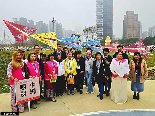 Phó Cục trưởng Cục Di trú Trần Kiến Thành (hàng thứ hai, từ trái sang thứ ba), Giám đốc Sở Phát triển Phụ nữ và Trẻ em Thành phố Đào Viên Đỗ Từ Dung (hàng thứ nhất, từ trái sang thứ tư) cùng các ủy viên quản lý Quỹ Phát triển Cư dân mới và nhân viên hướng dẫn đã chụp ảnh chung bên tác phẩm “Phúc Đạo” của cư dân mới.