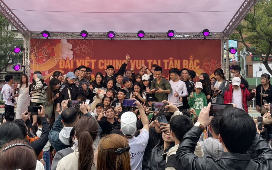 Hình ảnh: Ông Phạm Trường mở cửa cho công nhân nhập cư lên sân khấu chụp ảnh chung, được bao quanh bởi đám đông người hâm mộ. (Cục Lao động thuộc Chính quyền thành phố Tân Bắc cung cấp)