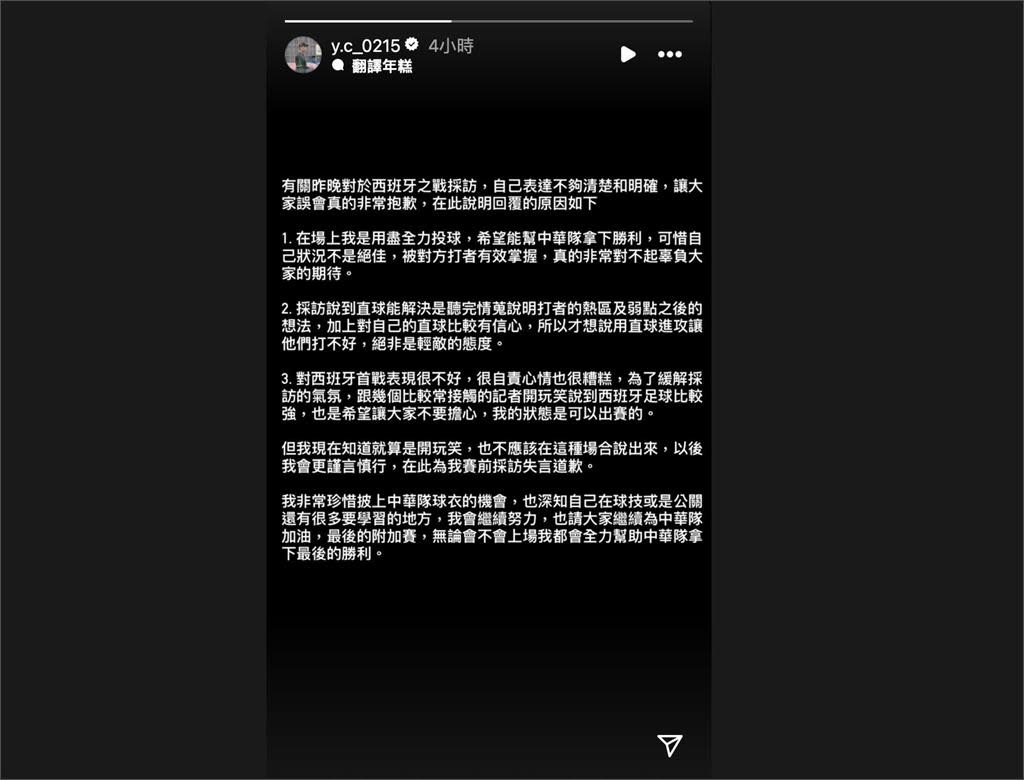 Trung tâm thể thao / Ký giả Ji Yun báo cáo: Trong buổi phỏng vấn trước trận đấu của đội tuyển Đài Loan gặp Nicaragua, khi được hỏi về màn trình diễn trong trận đấu đầu tiên vòng loại với Tây Ban Nha, tay ném Ngô Hữu Thành đã đùa rằng “Tưởng Tây Ban Nha giỏi nhất là bóng đá”. Câu nói này đã khiến người hâm mộ cho rằng Ngô Hữu Thành “lỡ lời” và đã quá coi thường đối thủ. Về việc này, Ngô Hữu Thành đã đăng tải lời xin lỗi trên trang cá nhân vào đêm 24, nhấn mạnh rằng mình không hề coi thường đối thủ mà chỉ đang đùa giỡn, và bày tỏ sự hối tiếc sâu sắc về phát ngôn của mình.